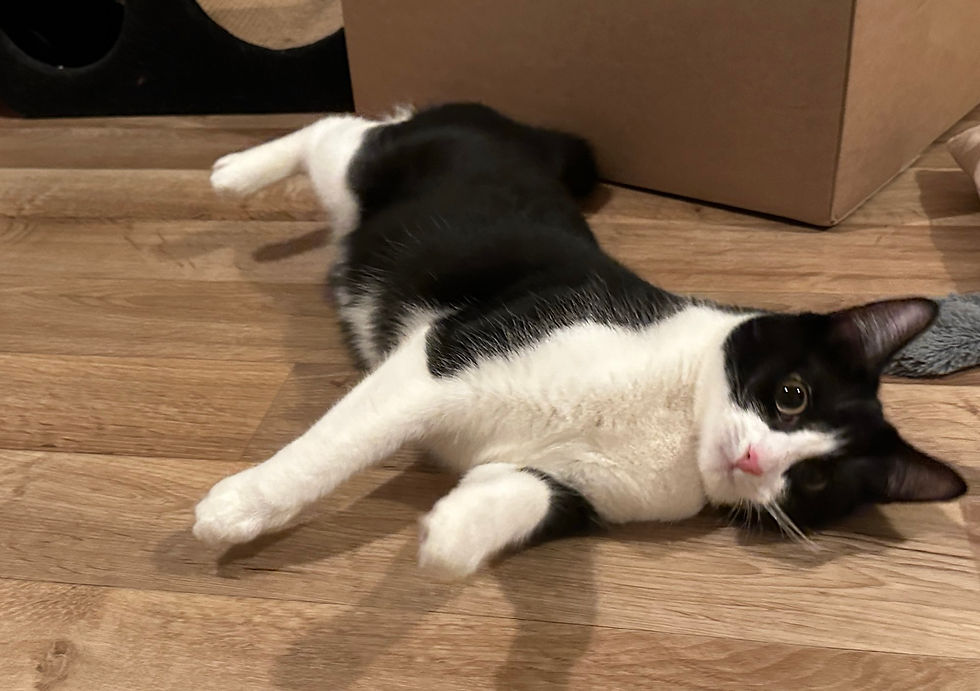 Mollie has a big purr and an even bigger character! She loves chasing her feather dangler toy and keeps her foster mum entertained with her amazing jumping and catching skills. Once she has caught her ‘prey’ she will run off with the feathers in her mouth, then likes to be praised for her skills!